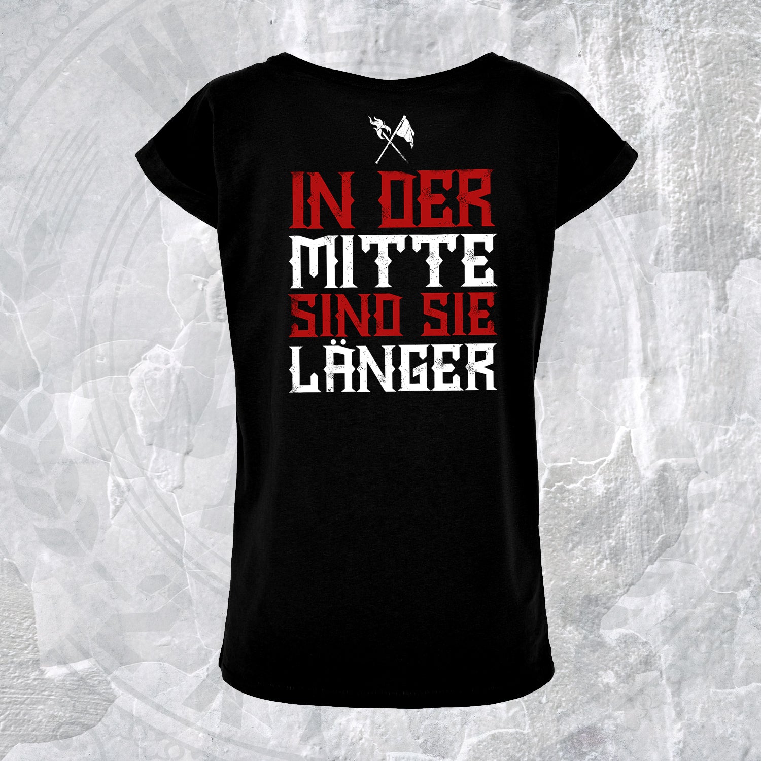 Rückendruck: "In der Mitte sind sie länger" in den Farben rot und weiß